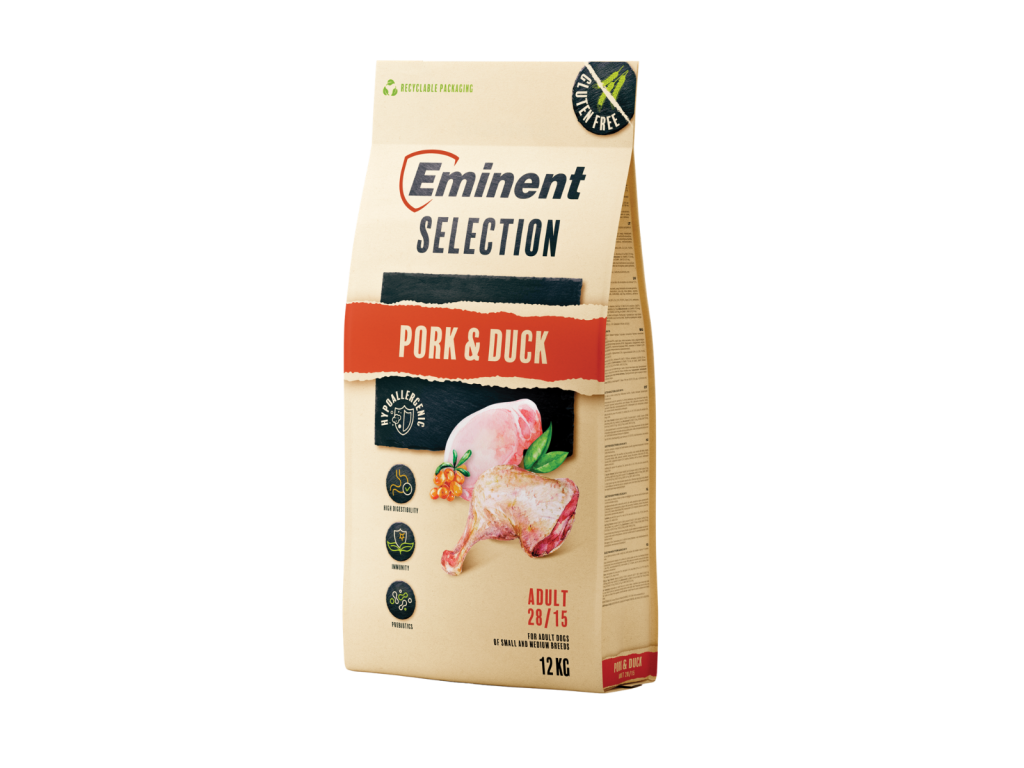 Složení: dehydrovaný živočišný protein (vepřový 16 %, kachní 8 %), rýže, hrách, drůbeží tuk, čirok, hydrolyzovaný živočišný protein, cukrovarské řízky, lněné semínko, chondroprotektiva (kolagen, MSM, glukosamin, chondroitin), lososový olej, beta-glukany, čekankový inulin (zdroj FOS), mannanoligosacharidy (MOS), bylinný komplex 0,22 % (ostropestřec, rakytník, zelený čaj, kurkuma), doplňkové látky (vitaminy, stopové prvky, aminokyseliny).